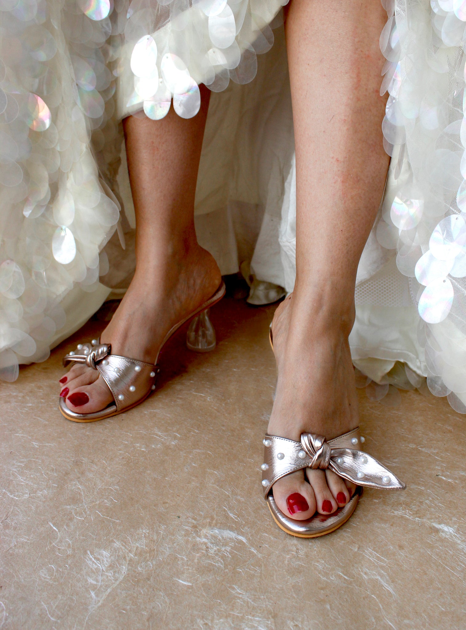 Soft rose-gold tones meet delicate pearls in these refined block heels, finished with a charming front bow that adds a touch of timeless romance. Comfortable, graceful, and full of sparkle — the perfect pair for someone who loves subtle glamour.