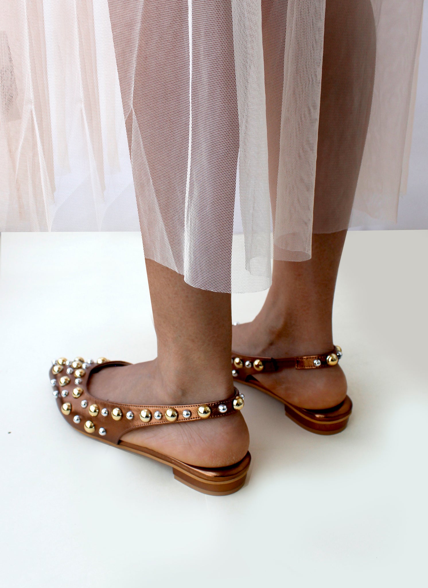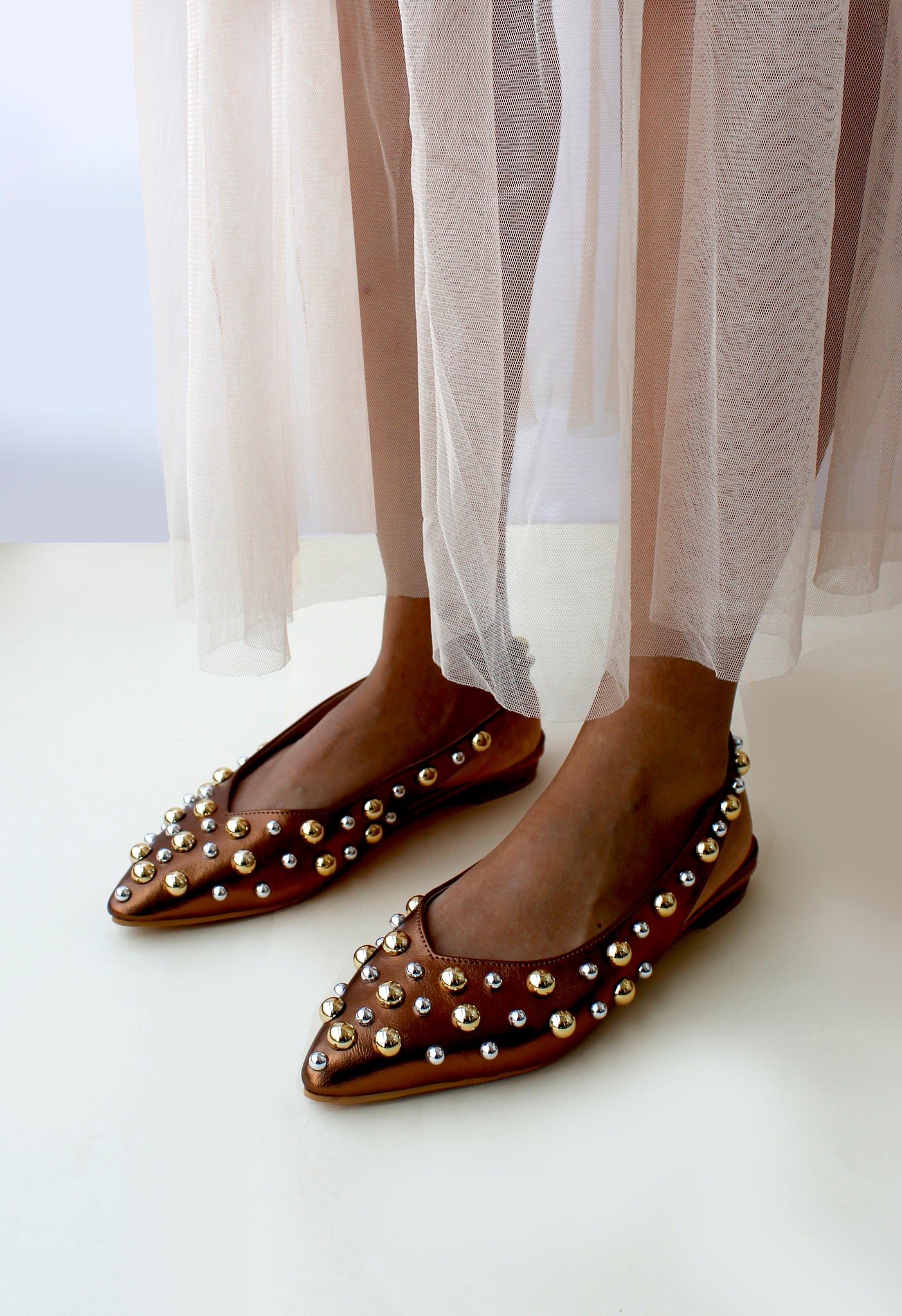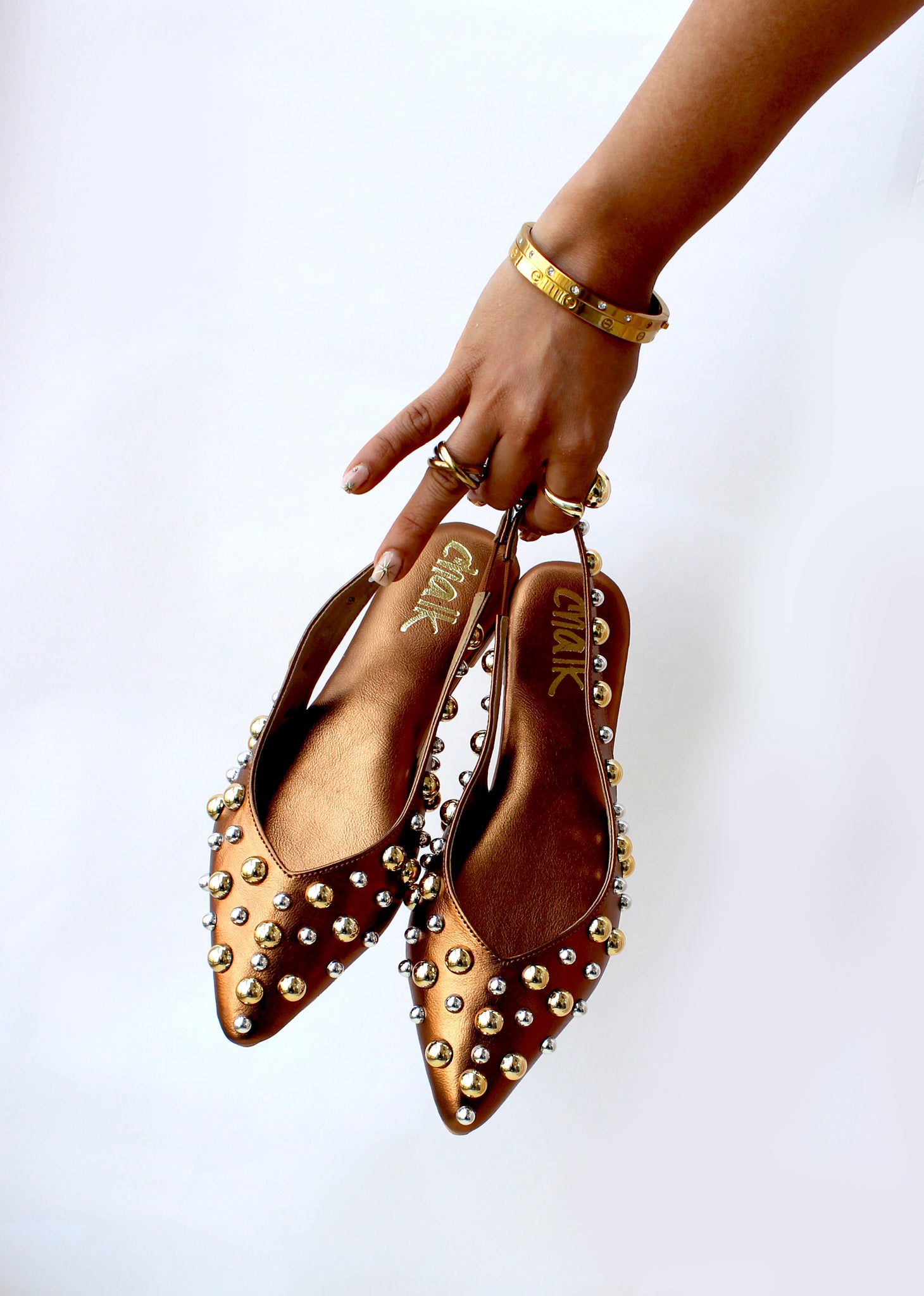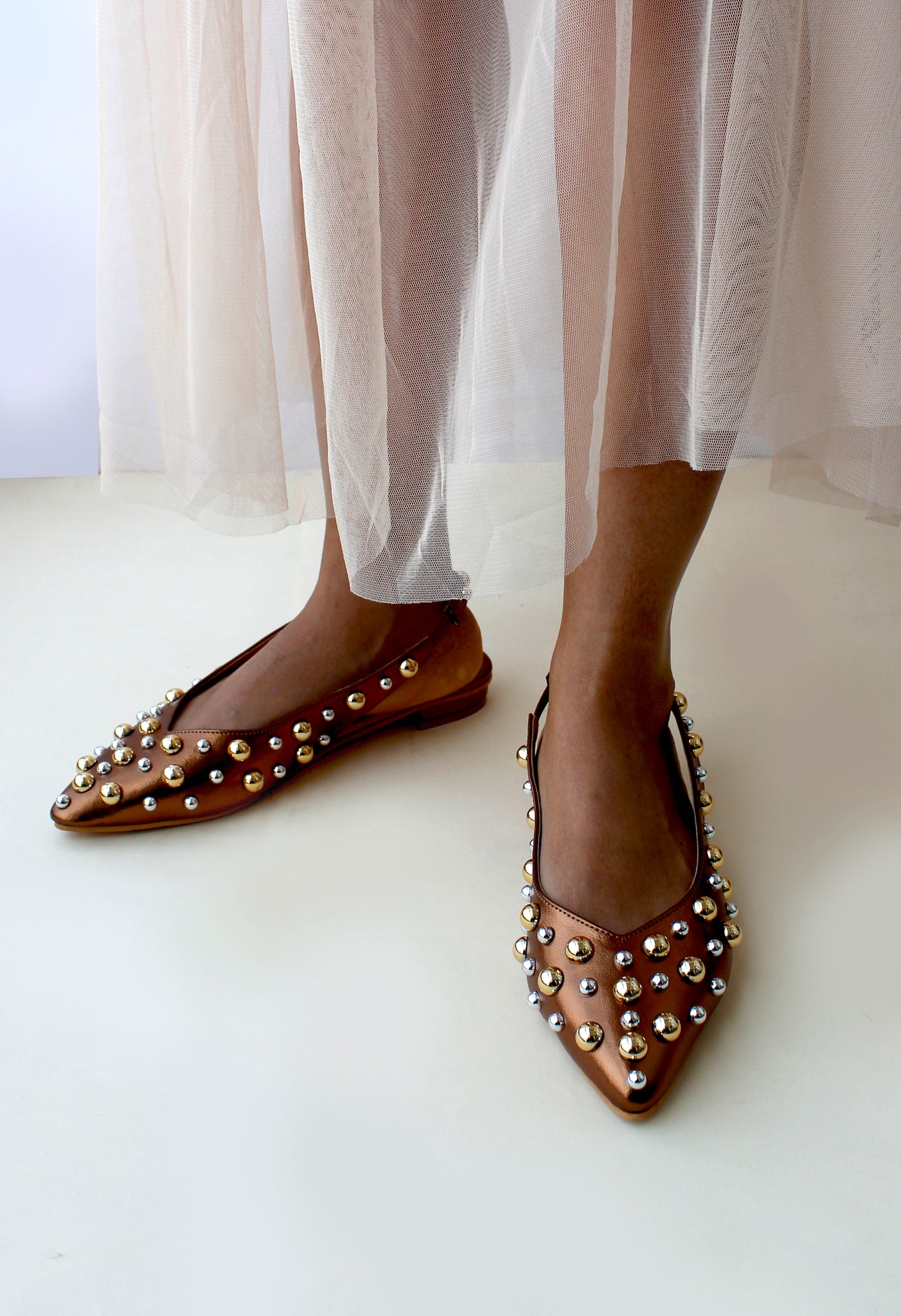 The Veronica pointed toes is a classic silhouette, elevated by mix metal  studded embellishments set on a metallic antique gold faux leather. They feature a easy to wear, slip-on back strap and a comfortable padded insole. Wear in your day or off-duty wardrobe for versatile looks.